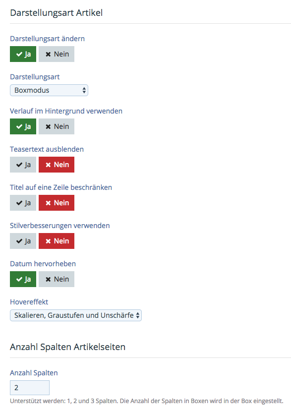 Auf den Seiten des Artikelsystems ist man auf eine feste Spaltenanzahl beschränkt, bei Artikel-Boxen hingegen kann man die Darstellung jederzeit beliebig mischen. So lassen sich beispielsweise auf einer Startseite die Artikelkategorien hierarchisch darstellen. Sehr wichtige Themen, in einer Spalte, wichtige Themen können in zwei Spalten dargestellt werden und der Rest in drei Spalten.